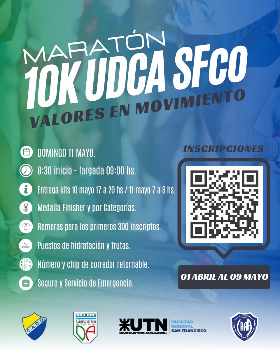 El próximo domingo 11 de mayo, nuestra Facultad Regional, junto a la Escuela Bilingüe Bicultural Dante Alighieri, el Club Atlético Deportivo Oeste y el Club Atlético Antártida Argentina, llevarán a cabo la Maratón 10K UDCA SFco 2025, un evento deportivo que busca promover los valores de la actividad física, la integración y el espíritu de comunidad, bajo el lema "Valores en Movimiento".